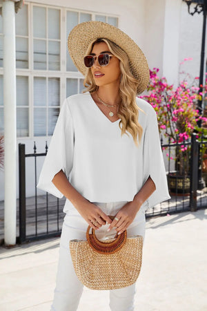 Women's Relaxed Fit V-Neck Blouse - Split Bell Sleeve